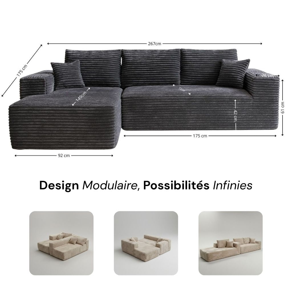 - Design actuel : lignes épurées, assises généreuses, velours côtelé épais et ultra doux.